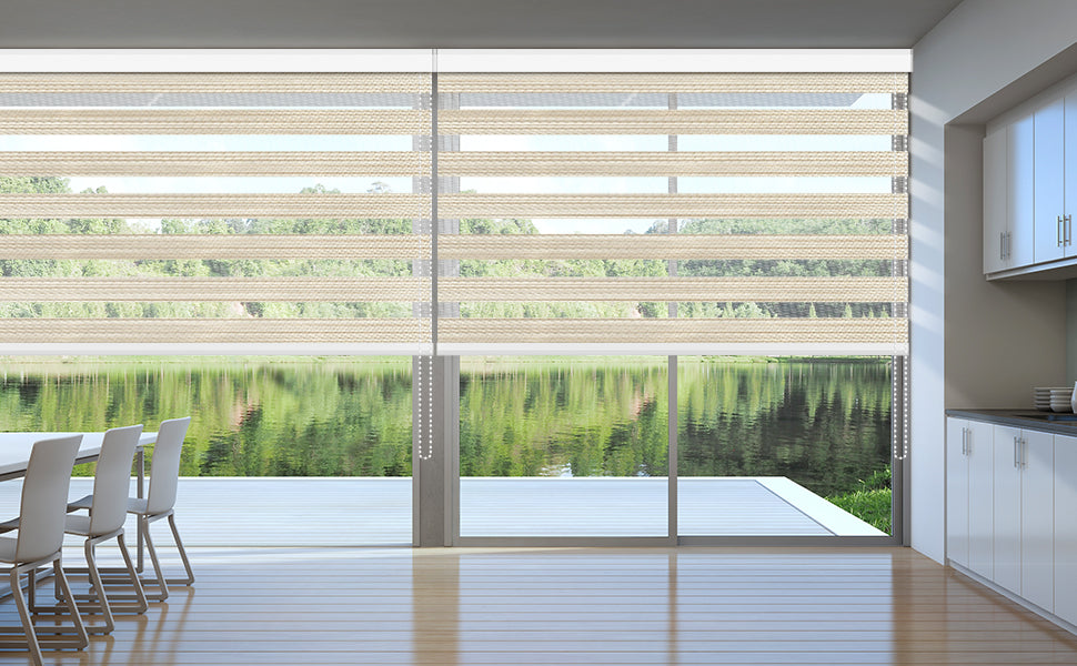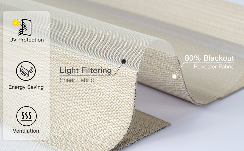 Material: Made with 50%-95% blackout waterproof dual-layer fabric combining light-filtering sheer and banded polyester. The sheer fabric softly filters sunlight and offers a view outside, while the banded polyester ensures privacy and blocks most incoming light. Adjust fabric alignment to control light levels. For perfectly aligned fabric bands across multiple blinds, place a single order to ensure they are produced in the same batch. Ideal for living rooms, patio sliding doors, offices, and more. For indoor use only.