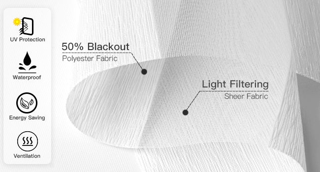 50% blackout, waterproof, adjustable double-layer sheer and banded polyester fabric. The sheer fabric lets in soft sunlight and maintains the outside view, while the banded fabric blocks most light and ensures privacy.
