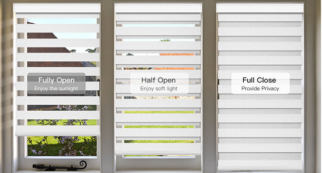 Material: Made with 50%-95% blackout waterproof dual-layer fabric combining light-filtering sheer and banded polyester. The sheer fabric softly filters sunlight and offers a view outside, while the banded polyester ensures privacy and blocks most incoming light. Adjust fabric alignment to control light levels. For perfectly aligned fabric bands across multiple blinds, place a single order to ensure they are produced in the same batch. Ideal for living rooms, patio sliding doors, offices, and more. For indoor use only.
